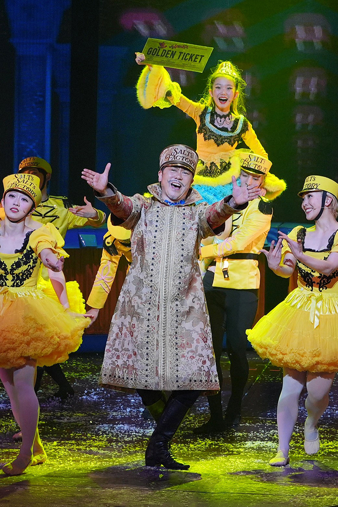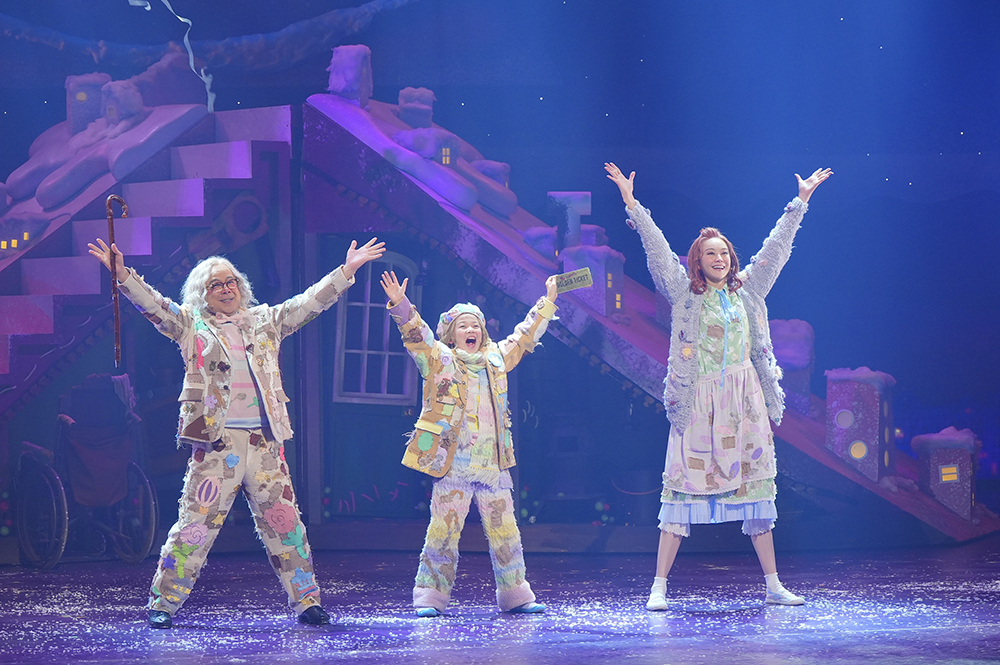 そしてかつてウォンカの工場で働いていた経験を持ち、チャーリーにウォンカのチョコレートの素晴らしさを伝え、その夢を叶えさせてやりたいと願っているチャーリーの祖父、ジョーじいちゃん役の小堺一機が、大活躍する2幕だけでなく、動きの極めて少ない1幕から醸し出していた温かさと、ひとさじの可笑しみが貴重なだけに、怪我による当面の休演が惜しまれる。だがその小堺に代わってジョーじいちゃんを滋味深く演じている聖司朗の真摯な演技も胸を打ち、その聖に代わってゴールデンチケットの当選者を伝えるジェリー役をスウィングの佐渡海斗がインパクト強く演じているのも、カンパニーの団結を感じさせる。小堺の早い回復を願うと共に、座組の確かさを実感できた。