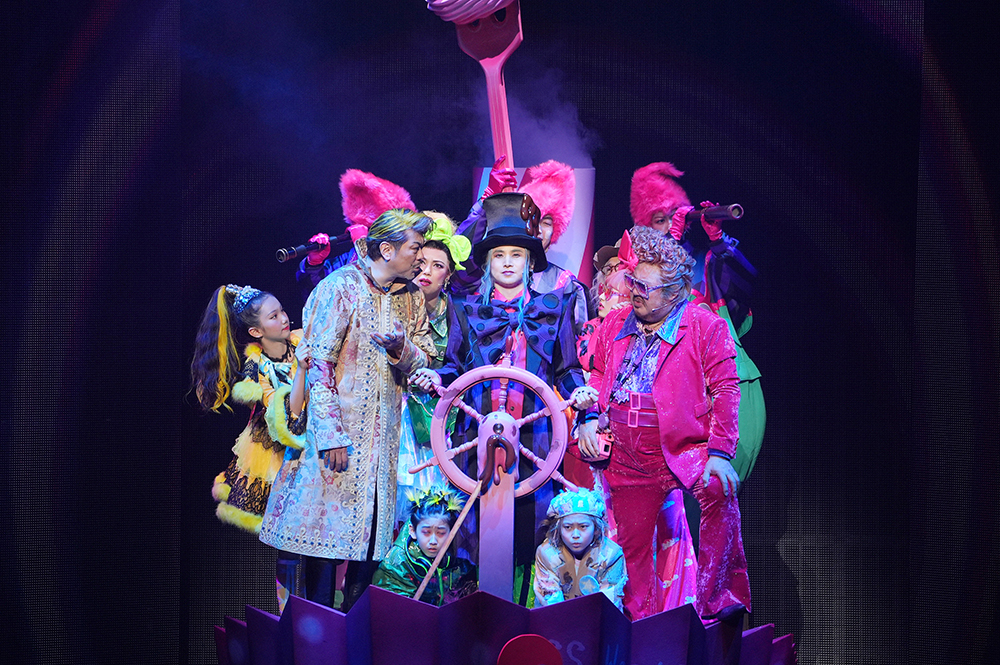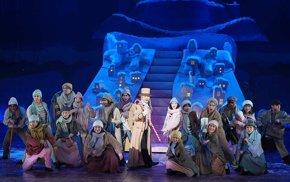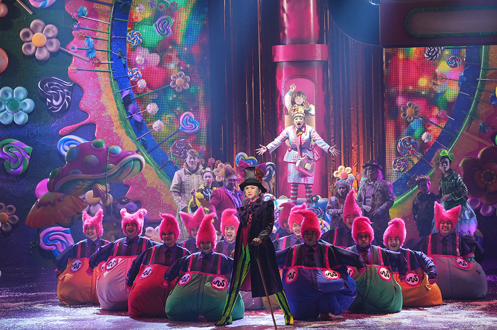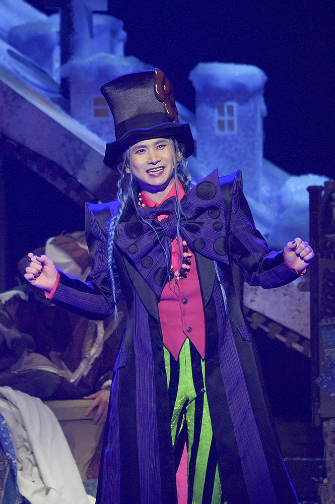 そのジェリーの放送に各国からレポートを送るチェリーの花陽みくが、パッション全開で役柄を演じているのも目を引くし、YOSHIE、松田尚子の振付を、時に軽やかに、時にエネルギッシュに、時にコミカルに踊り演じる、Amane、AYUBO、梅津大輝、おいら、大久保胡桃、小宮海里、佐藤志有、佐藤マリン、鈴木昌実、茶谷健太、津覇菜々、鶴岡政希、西口晴乃亮、馬場礼可、樋口祥久、船﨑晴花、細田和花、渡辺崇人が、街の人、ウォンカの世界の住人、ウンパ・ルンバで表情から仕草までガラリと変化させて目に耳に愉しい。スウィングの隈元梨乃と共に大所帯のカンパニーの迫力を真っ直ぐに伝え、作品の世界観を支えている。