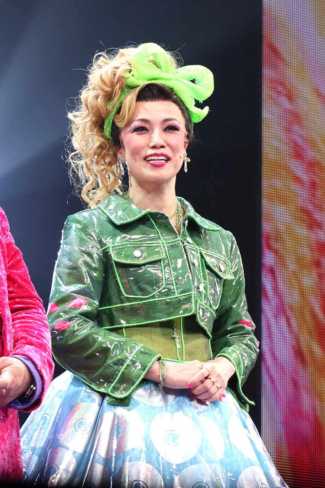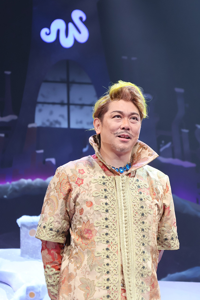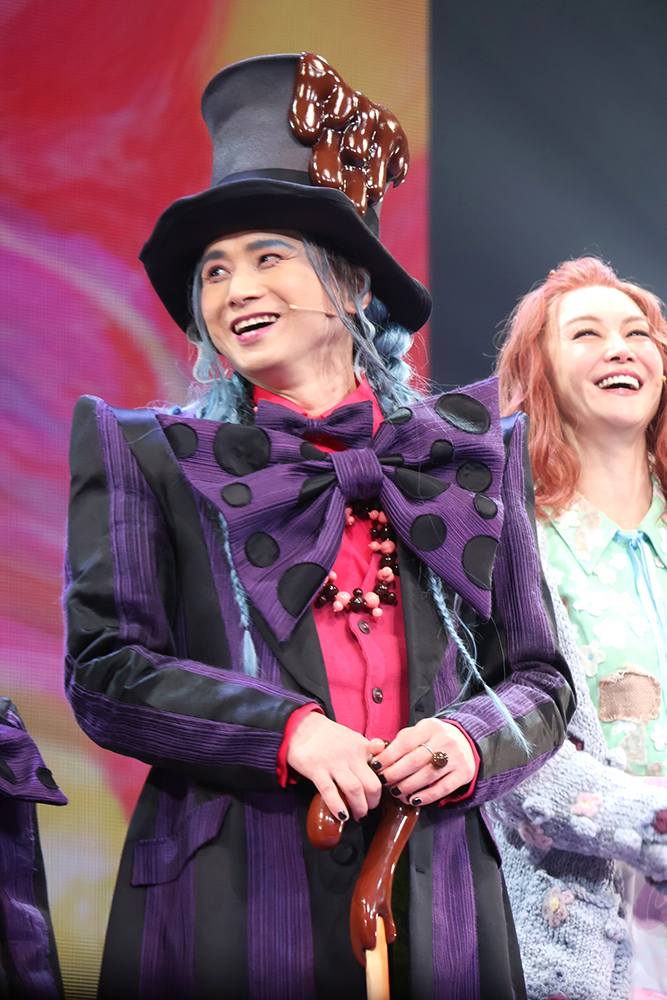 そのあまりに豊かなイマジネーションが氾濫する舞台のセンターに、ウィリー・ウォンカの堂本光一がいたこと。それがやはり舞台芸術、ミュージカルとしての日本版『チャーリーとチョコレート工場』を支えたのは明らかだった。自身の構成・演出によるやはりまるでびっくり箱が次々に開いていくに等しかった、エンターテイメントの粋を集めた『SHOCK』シリーズを牽引し続けた堂本には、この作品のファンタジー世界に吞まれることなく、軽々と背景にしてしまえる力が備わっていた。それは小西翔の衣装、ヘアメイク&ウィッグのSAKIEという、カリカチュア味も豊富で奇抜な面も強いビジュアルも難なく手中に納め、着られることなく着こなして魅せたことと併せて、余人をもって代えがたい日本独自の世界観のなかの、日本のウィリー・ウォンカだった。