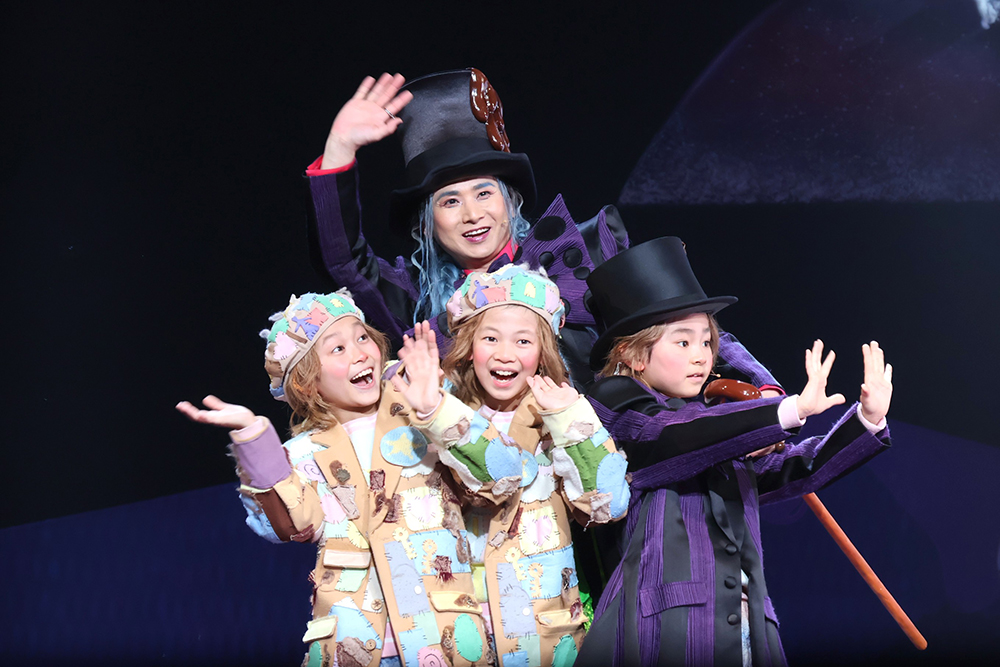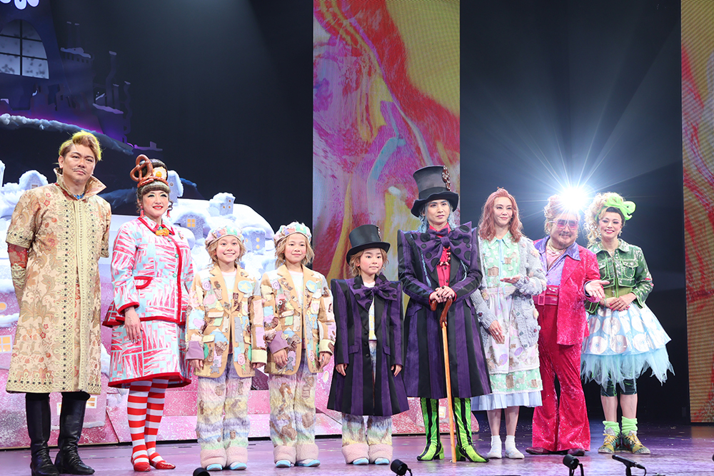 鈴木は「各家族の絆が初演よりも百倍ぐらい強くなっていて、ウォンカがよりカッコ良くなって素晴らしい作品になっていると思います」。芋洗坂は汗いっぱいで眼鏡が真っ白に曇って何も見えないから拭かせてもらいますと笑わせながら、無理はいけないが「一生懸命このメンバーで、色々なことを乗り切っていきたい」と意欲的に。岸は「3年ぶりにこの世界に帰ってこられて、皆様にこの作品をお届けできることを本当に幸せに思っております」と感慨深く述べたあと、自身もアンサンブルから出発しているという芸歴に触れ「代役の二人が見事に務めあげてくれて、誇りに思います」と力強いエールを。彩吹は初演の帝国劇場と、再演の日生劇場で天上のライトが変化していることに触れて「演じている私たちは自然にイマジネーションの世界に入りこむことができる、皆さんがそういうふうにこの空間づくりをされているんだなと」と、日生劇場でしか味わえない『チャーリーとチョコレート工場』の世界の醍醐味を語った。
