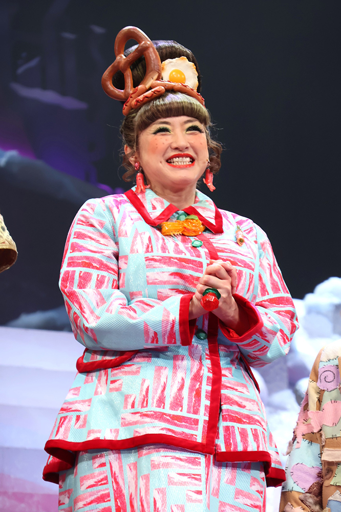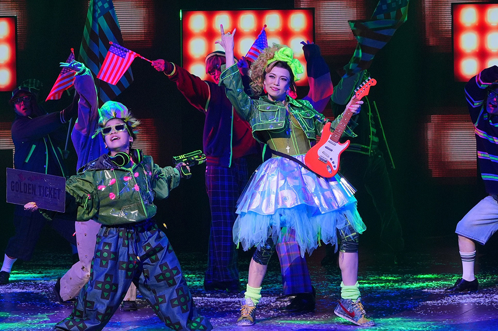 チャーリーと共にチョコレート工場に足を踏み入れる各国の家族は、肥満児オーガスタスの母親で、バイエルンで肉屋を営むグループ夫人を、森公美子とのWキャストだった初演からシングルキャストで鈴木ほのかが引き継いだ。ひたすら食べ続ける子供をあんなに愛しながら心配しないのは、自身も食べることが大好きだからだろうな、とすんなり思わせる思い切り弾けた演技で惹きつける。もうひと役、バケット家でのジョージナおばあちゃんには優しさがにじみ出て、鈴木の持ち味がまるごと生きている。息子のオーガスタスは有澤奏と渡邉隼人のWキャスト。ゲネプロの渡邉は食欲が身の危険も超える様を賑やかに演じていて、有澤がどうくるかにも期待大だ。