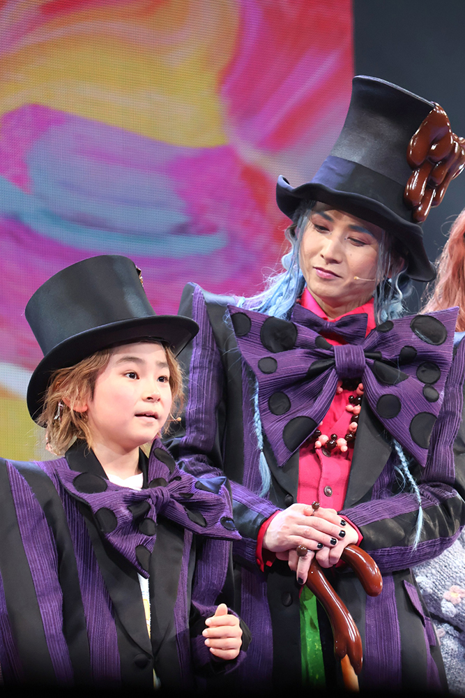 実際、ウォンカはかなり難しい役どころだ。物語の中心を担っているのはチャーリーだし、謎の人でもあるだけに特に1幕の出番は思うほど多くない。それでもシルエットが現れただけで、チャーリーが心から憧れるウォンカその人をきっちりと客席に印象づけ、その登場を待つ気持ちにさせなければ成立しない。つまりスターでなければ務まらない役どころに堂本光一をキャスティングしたこと。それがすなわち日本版『チャーリーとチョコレート工場』のすべてを握っていた。
