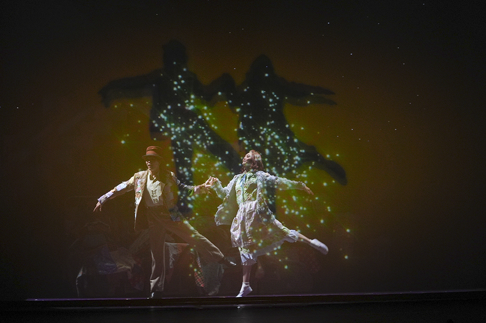 それはまさしく、演出のウォーリー木下と美術や衣裳など作品のビジュアル面を統括するアートディレクションを務めた増田セバスチャンのイマジネーションに応えた美術の石原敬、照明の藤井逸平、映像の鈴木岳人らが想像力を具現化した瞬間だった。しかもその圧倒的なシーンを頂点に、絵本のようであり、アメリカンコミックのようであり、アニメーションのなかのようでもある、多彩な場面、場面が次々に展開されていくのだ。その様はすべてが目の前で繰り広げられている、まぎれもない舞台芸術でありつつ、どこか舞台作品を越えたテーマパークにも思える驚きに満ちていたものだ。